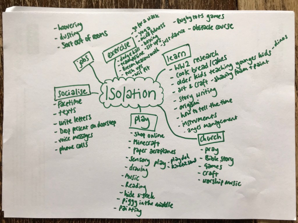 You’ll see our categories of play/learn/church/socialise/jobs/exercise. You need to know my jobs list for Liam is not included but is very. long. Also please note I did not suggest ‘anger management’. That was a child. Perhaps they are as fearful as I am of the results of us being confined to a small space?