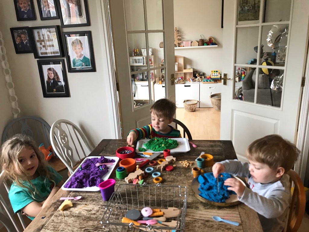 Calpol disaster avoided, we diligently started on activities. Kinetic sand, reading, number play…we were flying through them. Two older kids went and played school with the younger 3, and I thought, we’ve got this thing sorted.